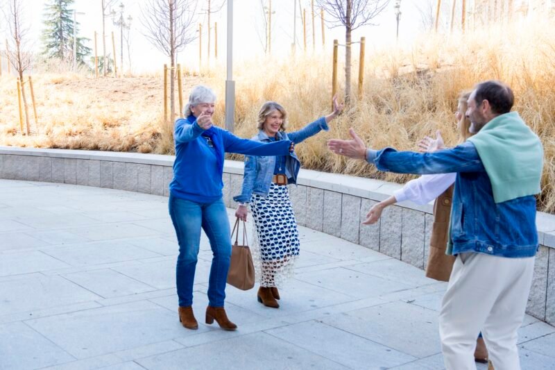 group of happy middle-aged friends greeting each other in the street