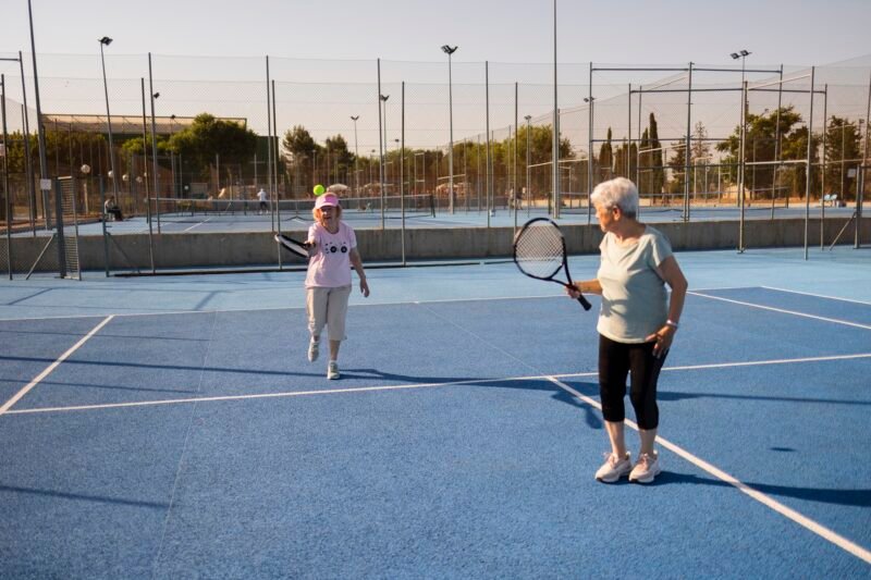 Senior women playing tennis on a sunny blue court, enjoying a lively match with friends while staying fit, social, and active during retirement