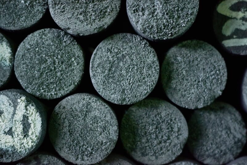 Directly above view of graphite manufactured articles of unequal height standing at production department of modern plant, close-up shot