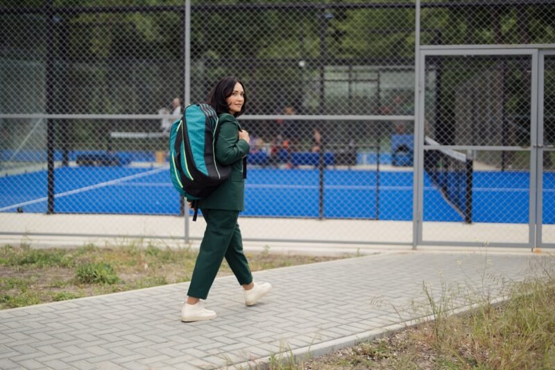 Woman in green suit carrying a large backpack with tennis equipment near a blue padel tennis court on a cloudy day.