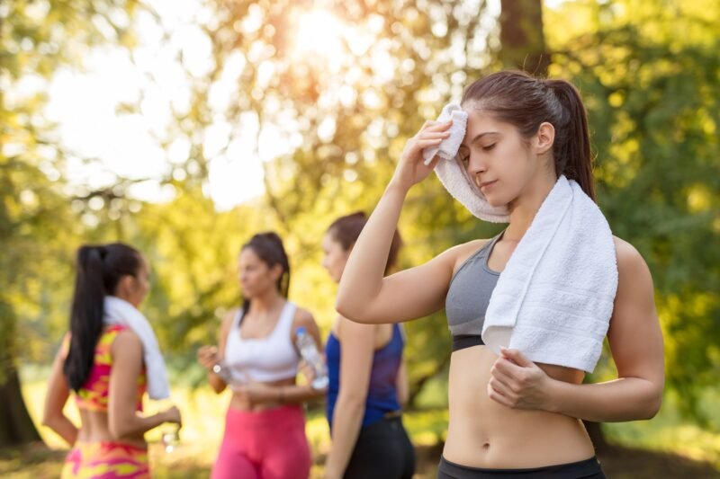 Young athletic woman taking a break after exercising outdoors, wiping sweat and catching her breath