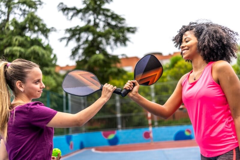 Team of two multi-ethnic women clashing rackets before playing pickelball in an outdoor court