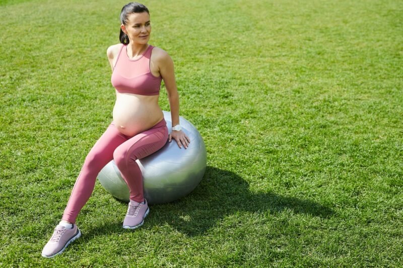 Healthy pregnant woman in pink clothing sitting on fitness ball and training outdoors in the park